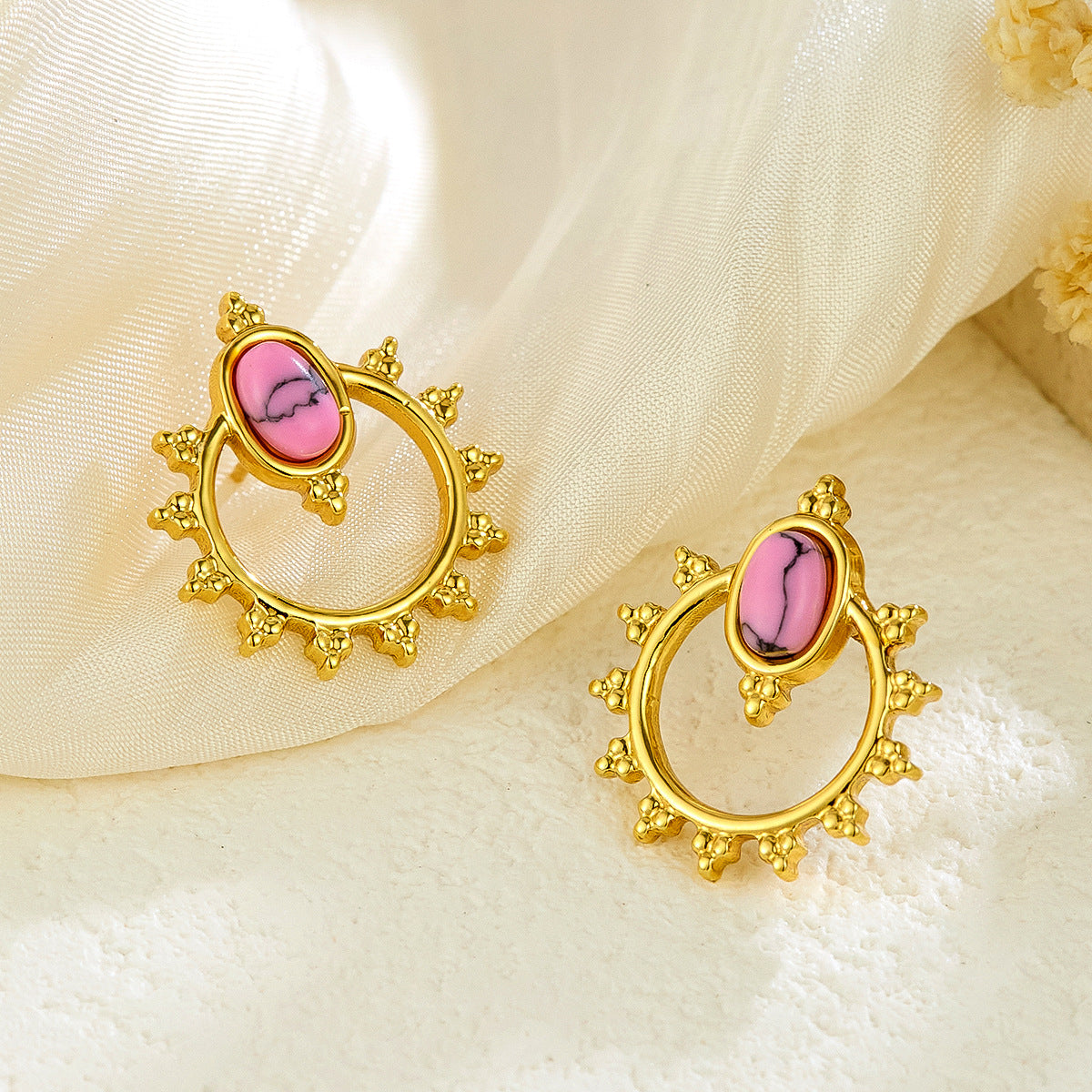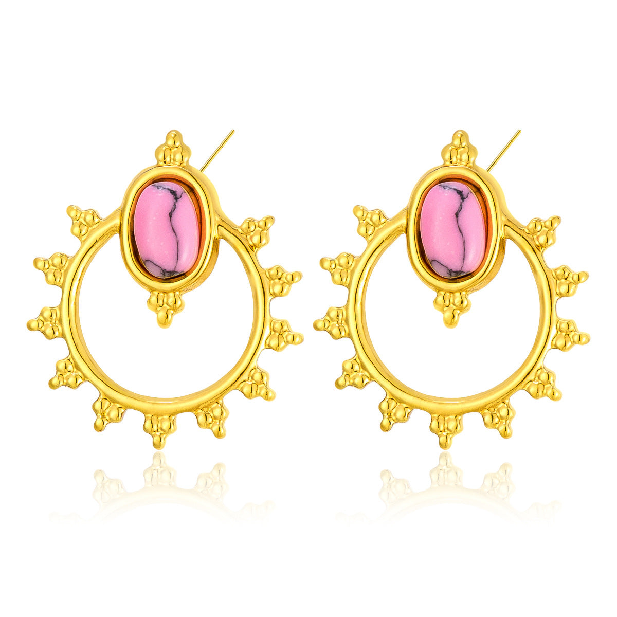 New French-Style Fashionable Vintage Unique Textured Titanium Steel Earrings, 18K Gold Plated with Natural Stones Sun Earrings, Niche Jewelry