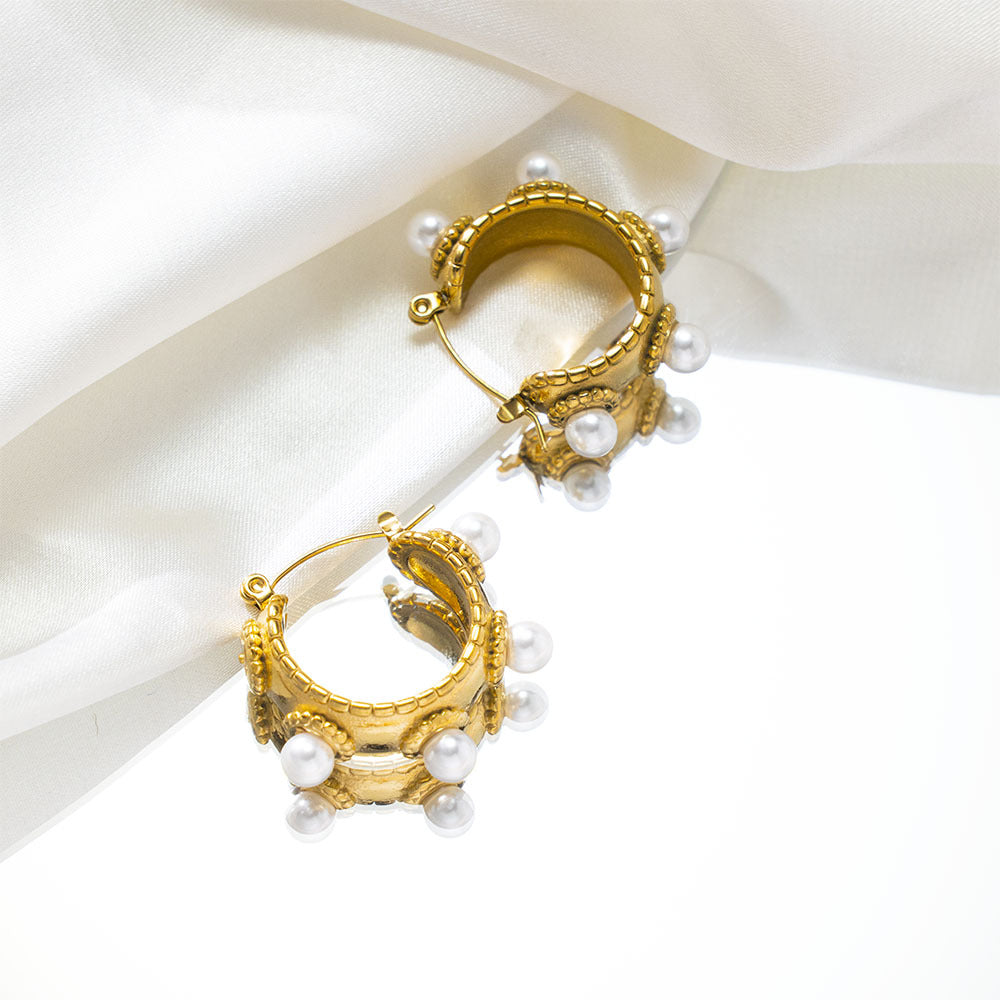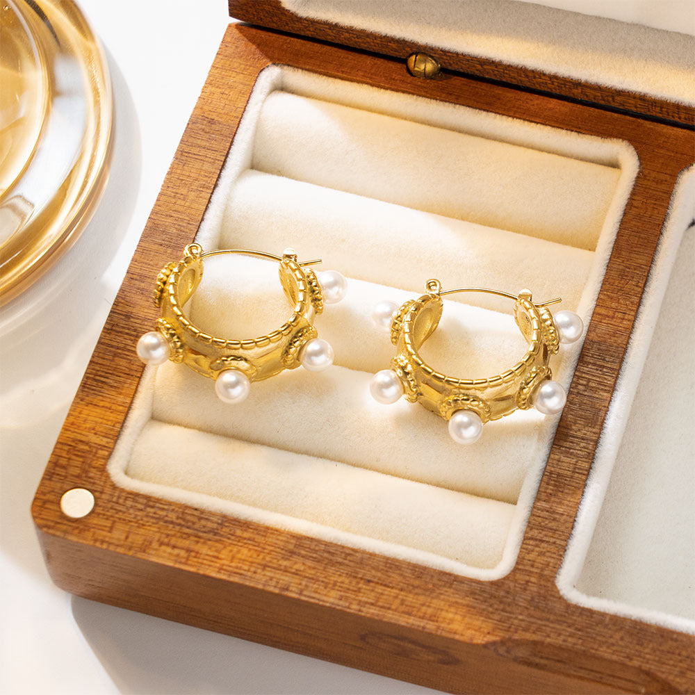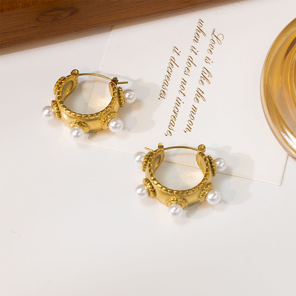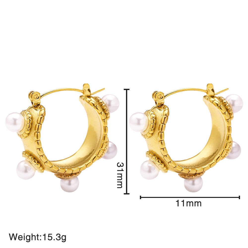 Dopamine INS Style 18K Gold Plated Earrings, C-Shaped Hoops with Retro Baroque Pearls, Stainless Steel & Titanium Steel for Women