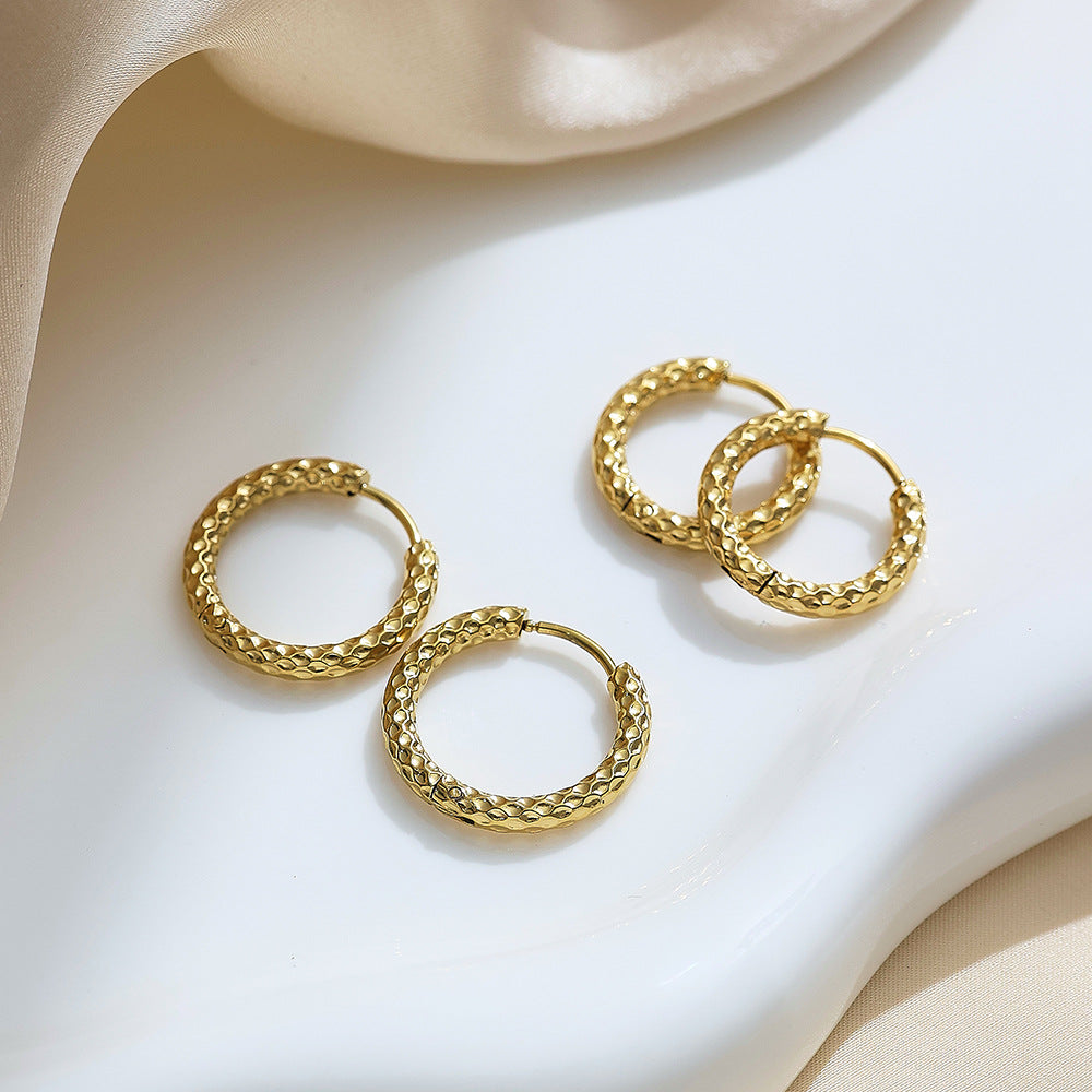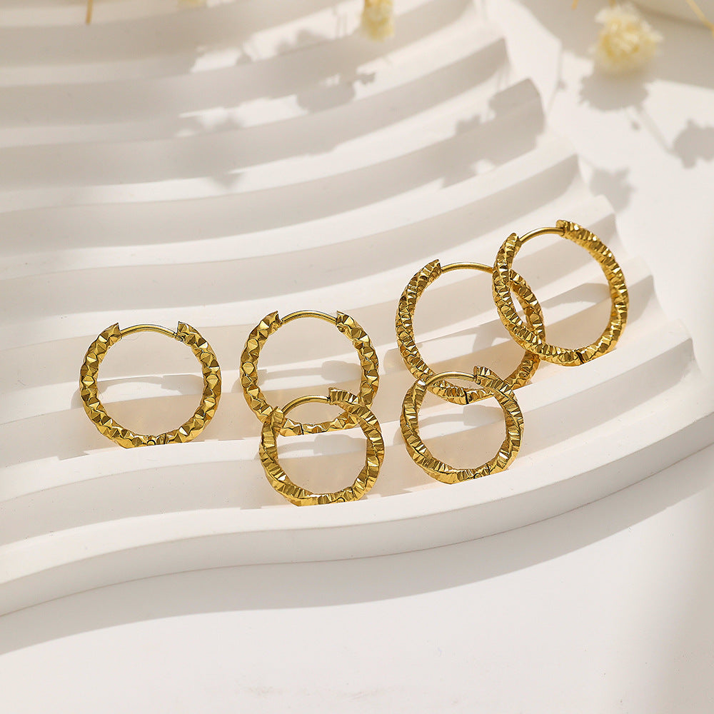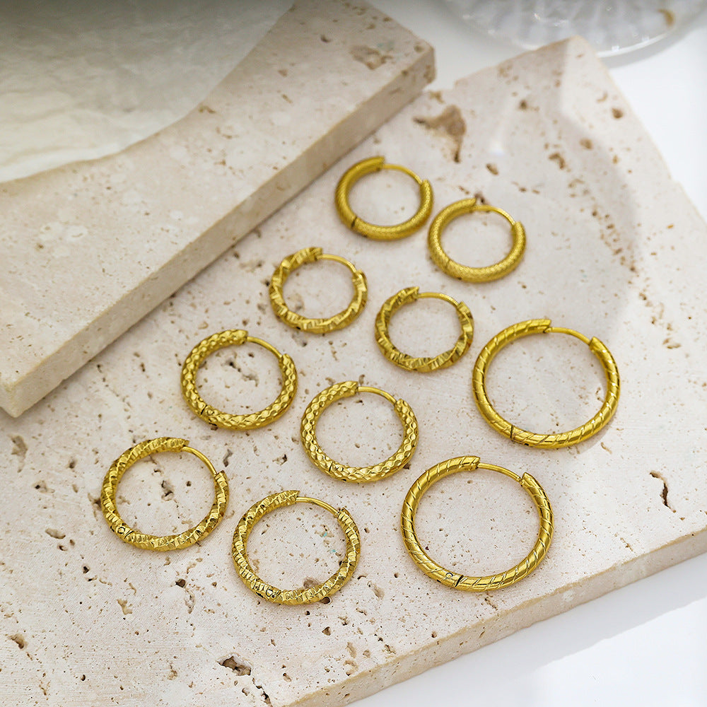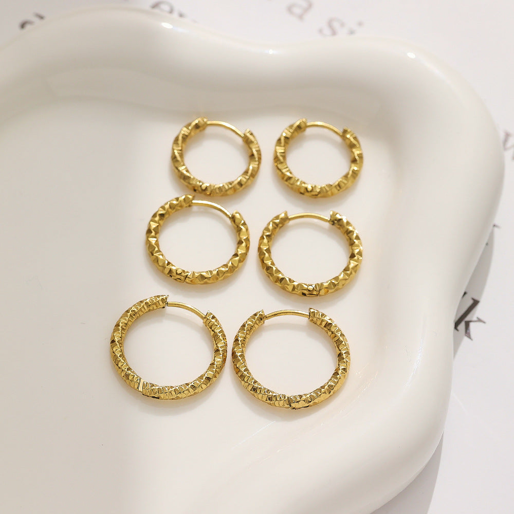 Brand X Retro Gold Titanium Steel Earrings, Embossed Circle Hoops, Minimalist Stylish Fade-Resistant Ear Cuffs for Women