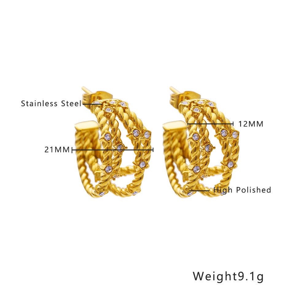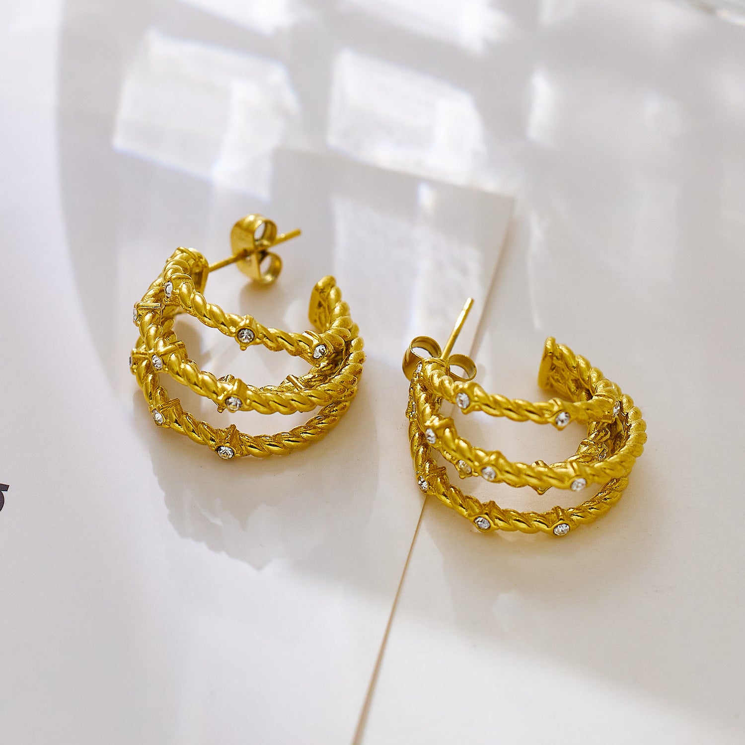 Cross-Border 18K Gold Plated Diamond-Inlaid Studs, Retro Gold Four-Layer C-Shaped Stainless Steel & Titanium Steel Earrings for Women