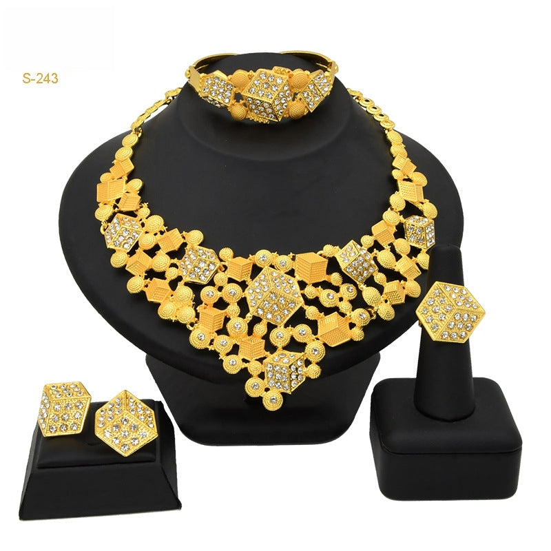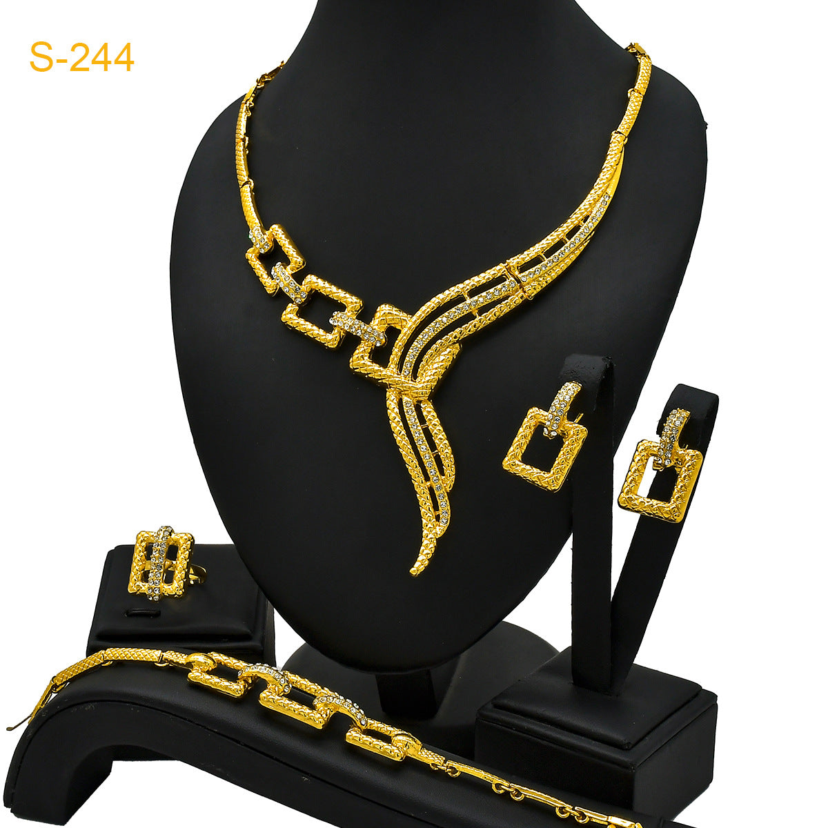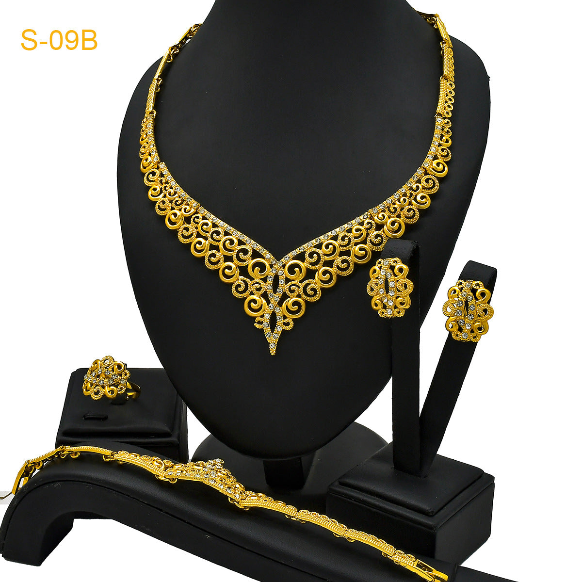Dubai 24K Gold-Plated Bridal Jewelry Set, 4-Piece Arabic Women's Wedding Necklace, Ring, Earrings and Bracelet, Wholesale