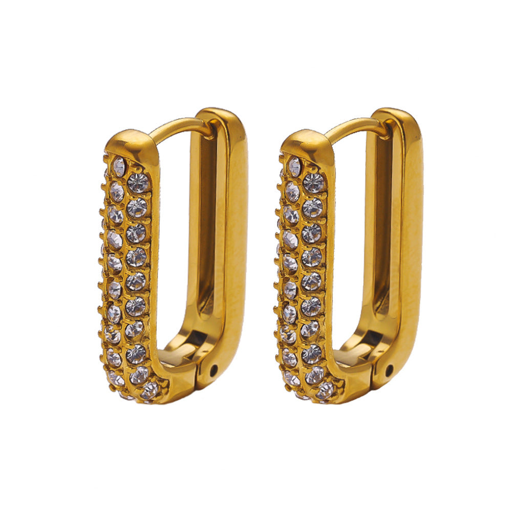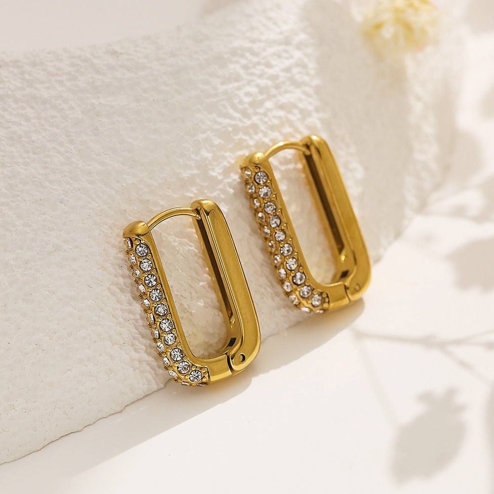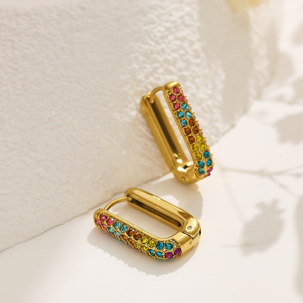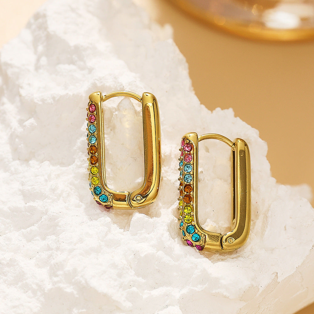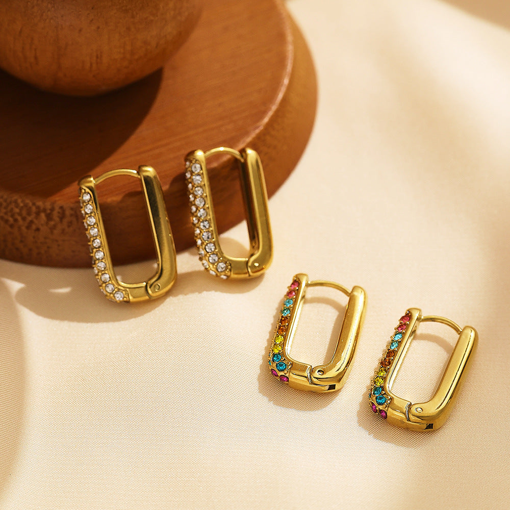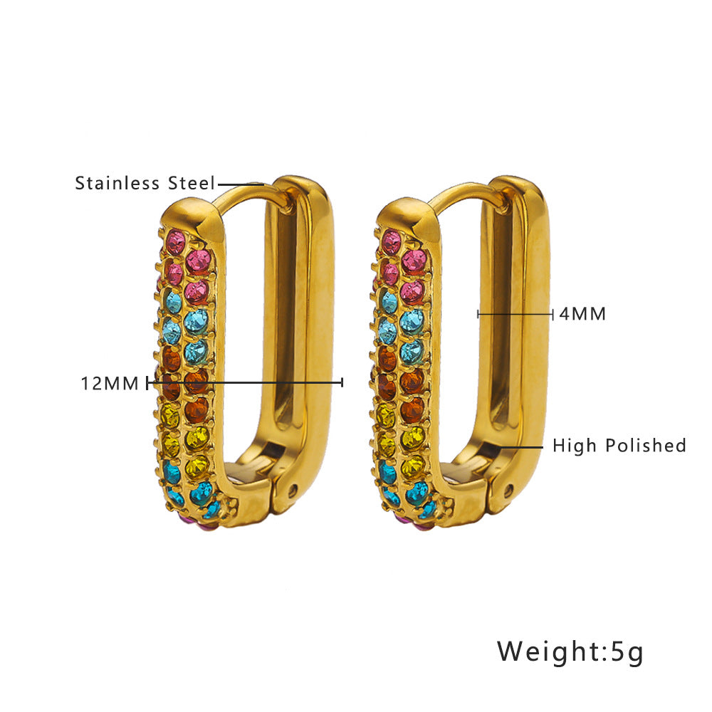 INS Style 18K Gold Plated Earrings, Square Colorful Cubic Zirconia Diamond - Inlaid Ear Cuffs, Versatile Stainless Steel & Titanium Steel Studs for Women