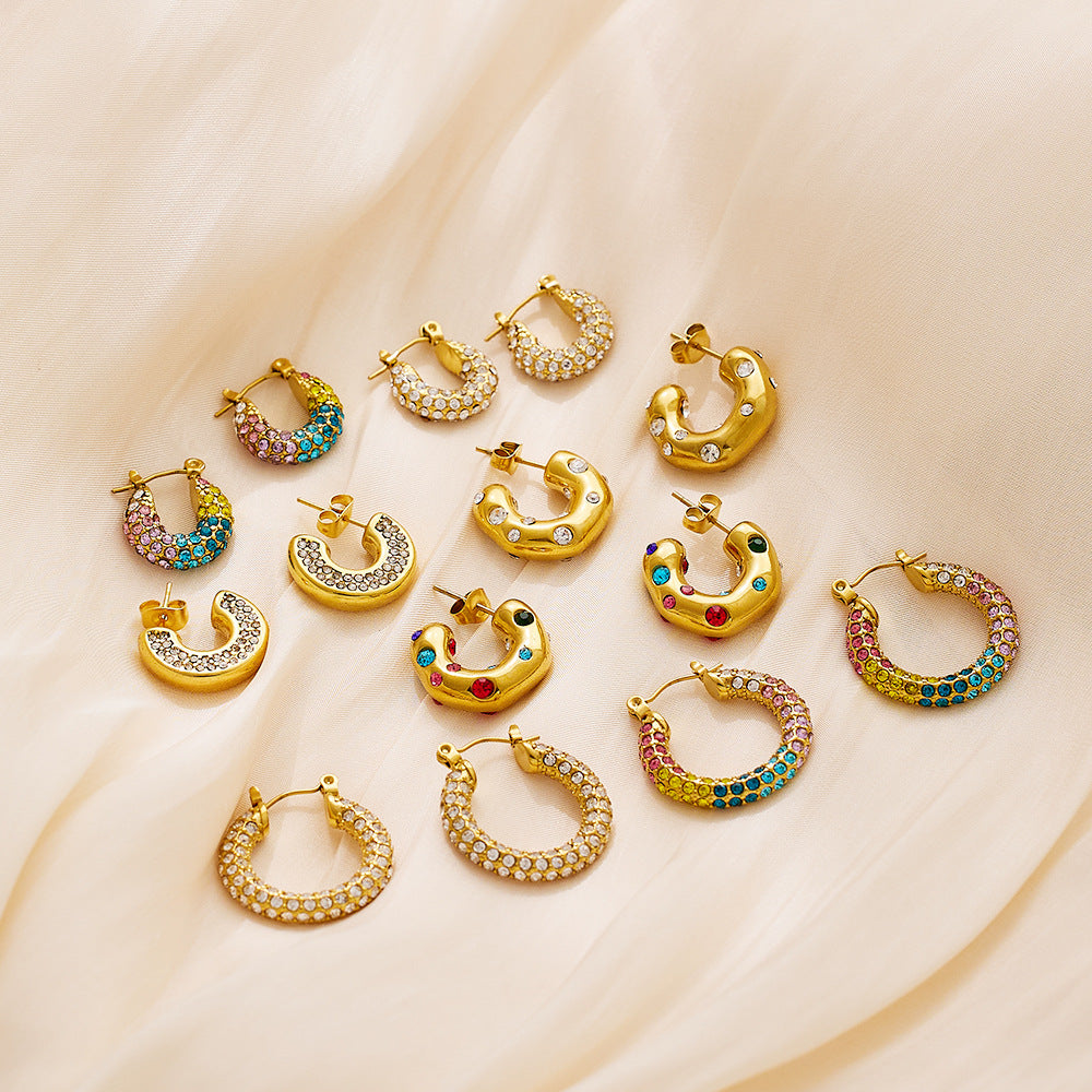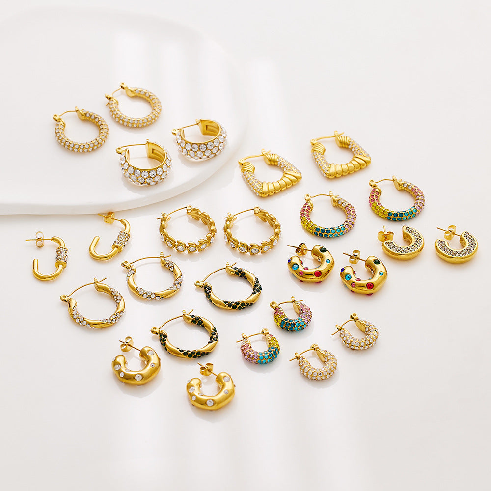 Cross-Border New Arrival Stainless Steel Earrings, 18K Gold Plated C-Shaped Hoops with Diamond/Pearl/Zircon Inlay, Niche High-End Irregular Jewelry