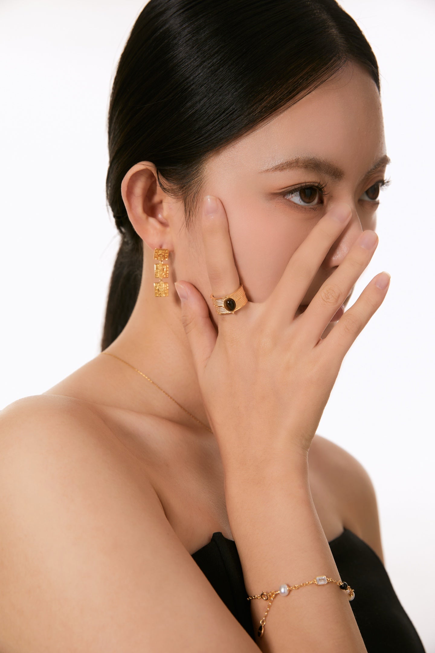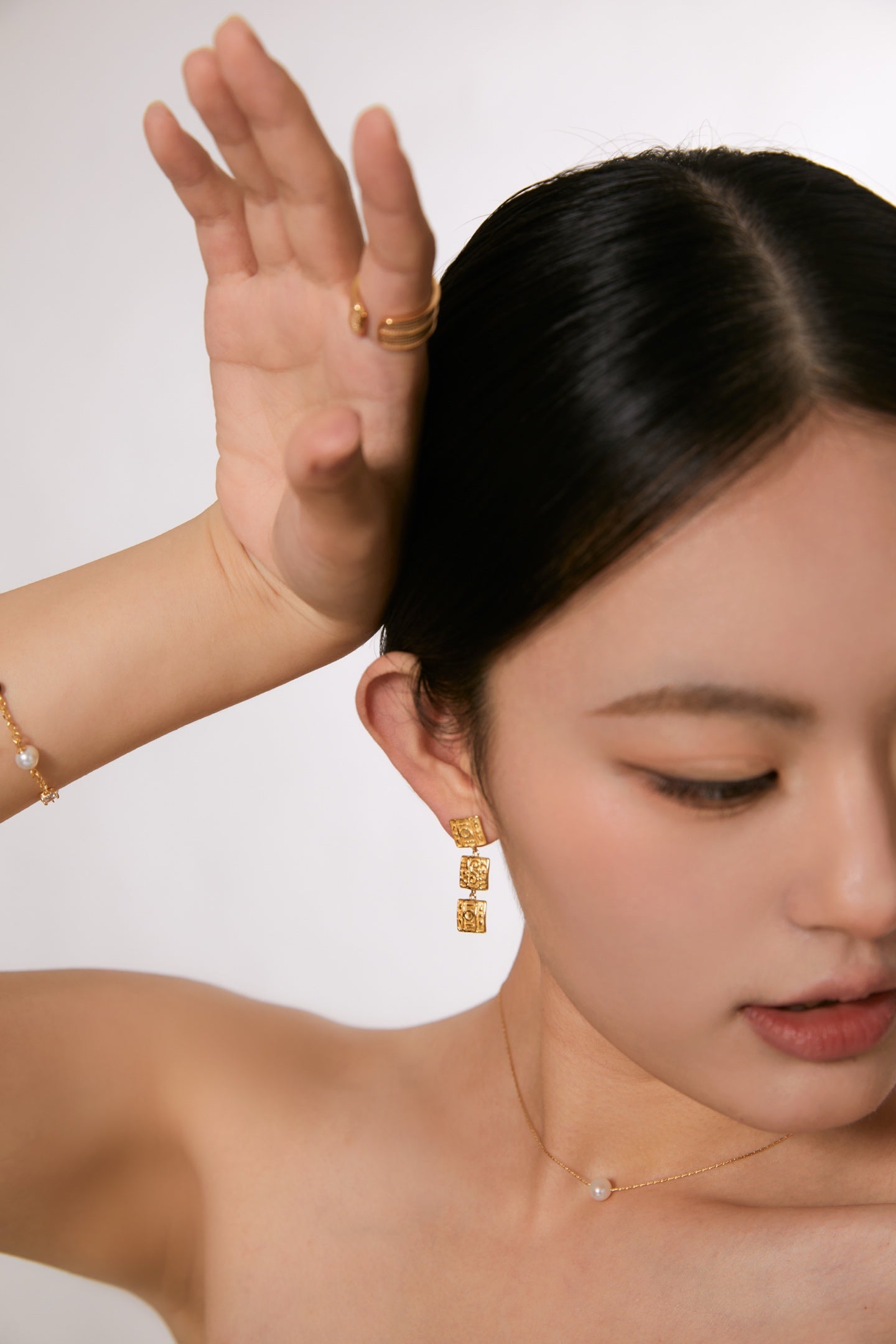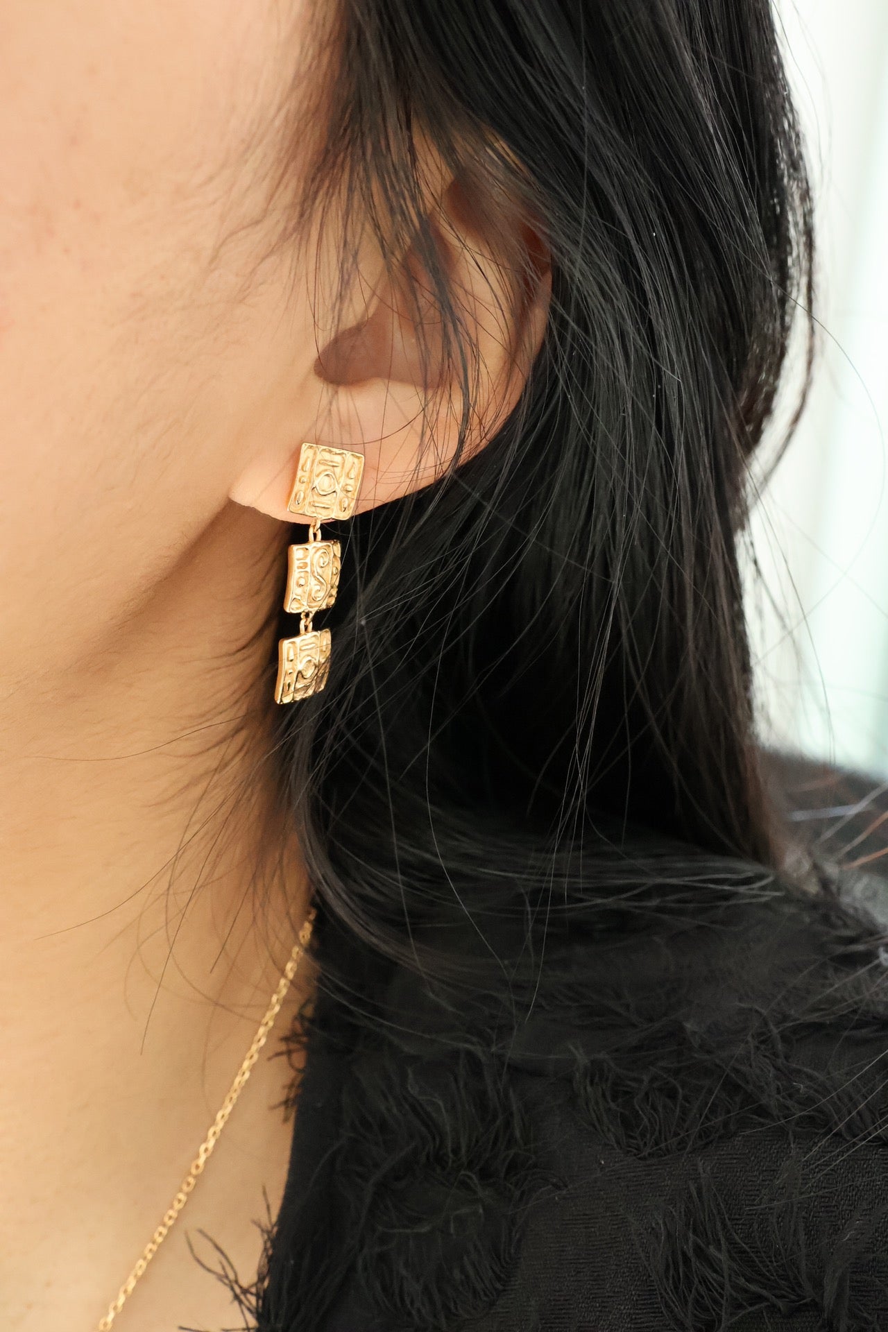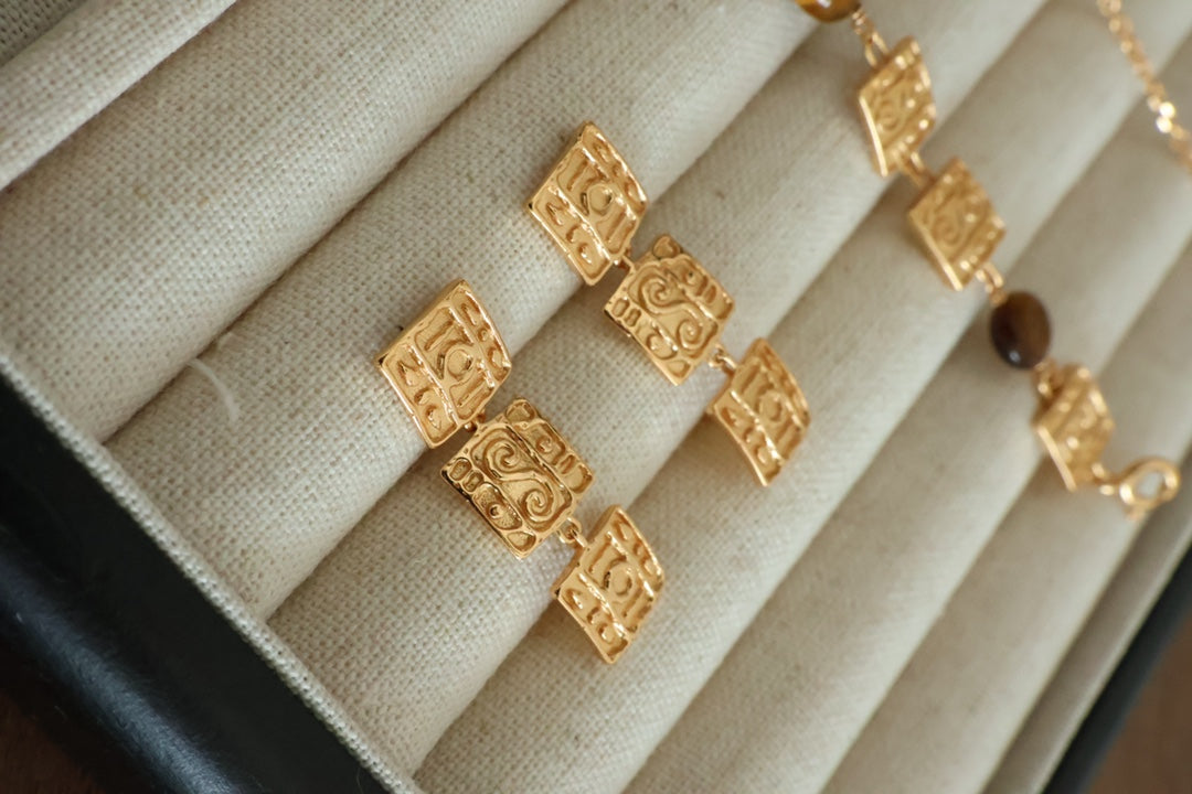 Niche Engraved Relief Sterling Silver Set - Gold-Tone Earrings and Necklace, Artisan Art Deco Statement Jewelry for Women