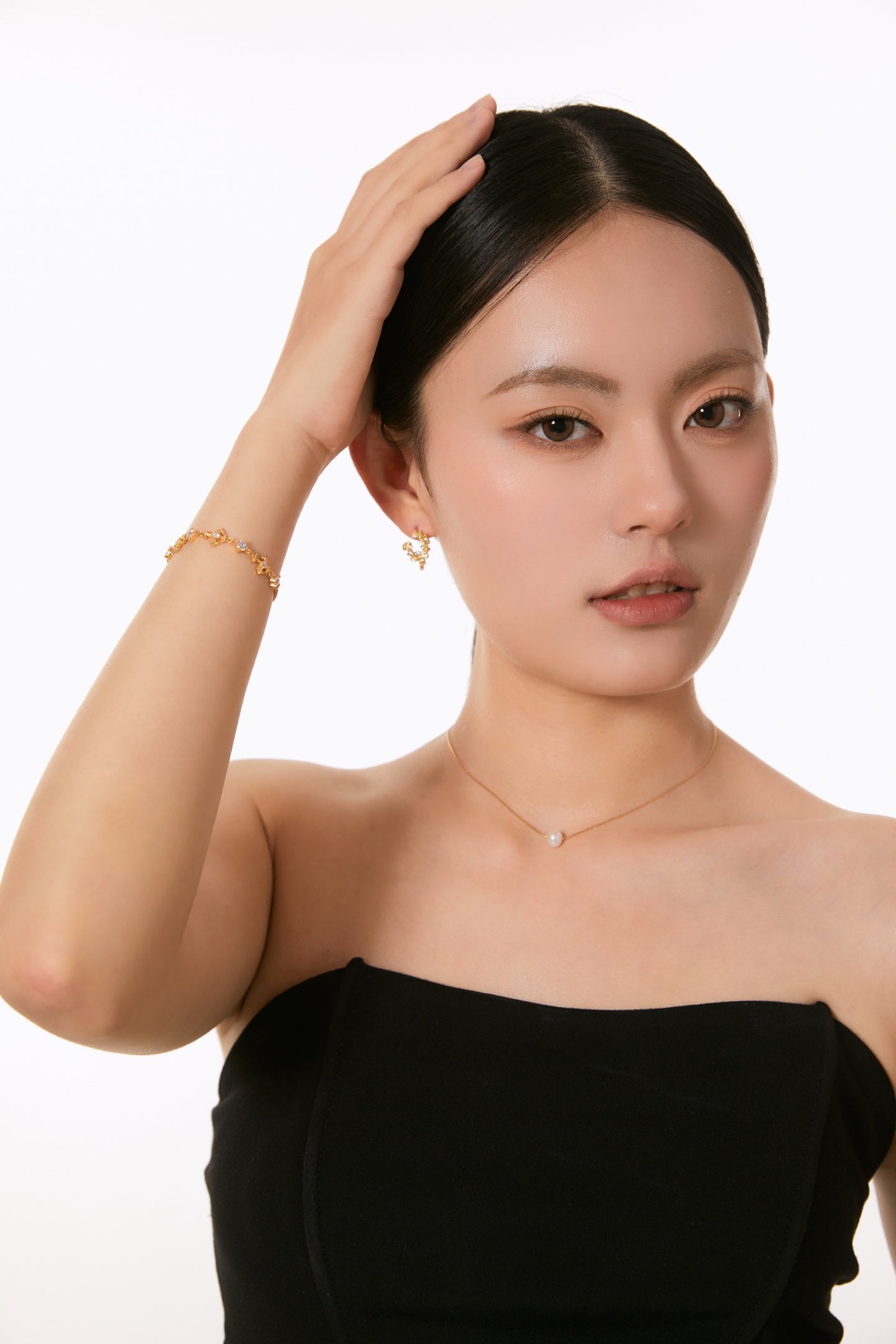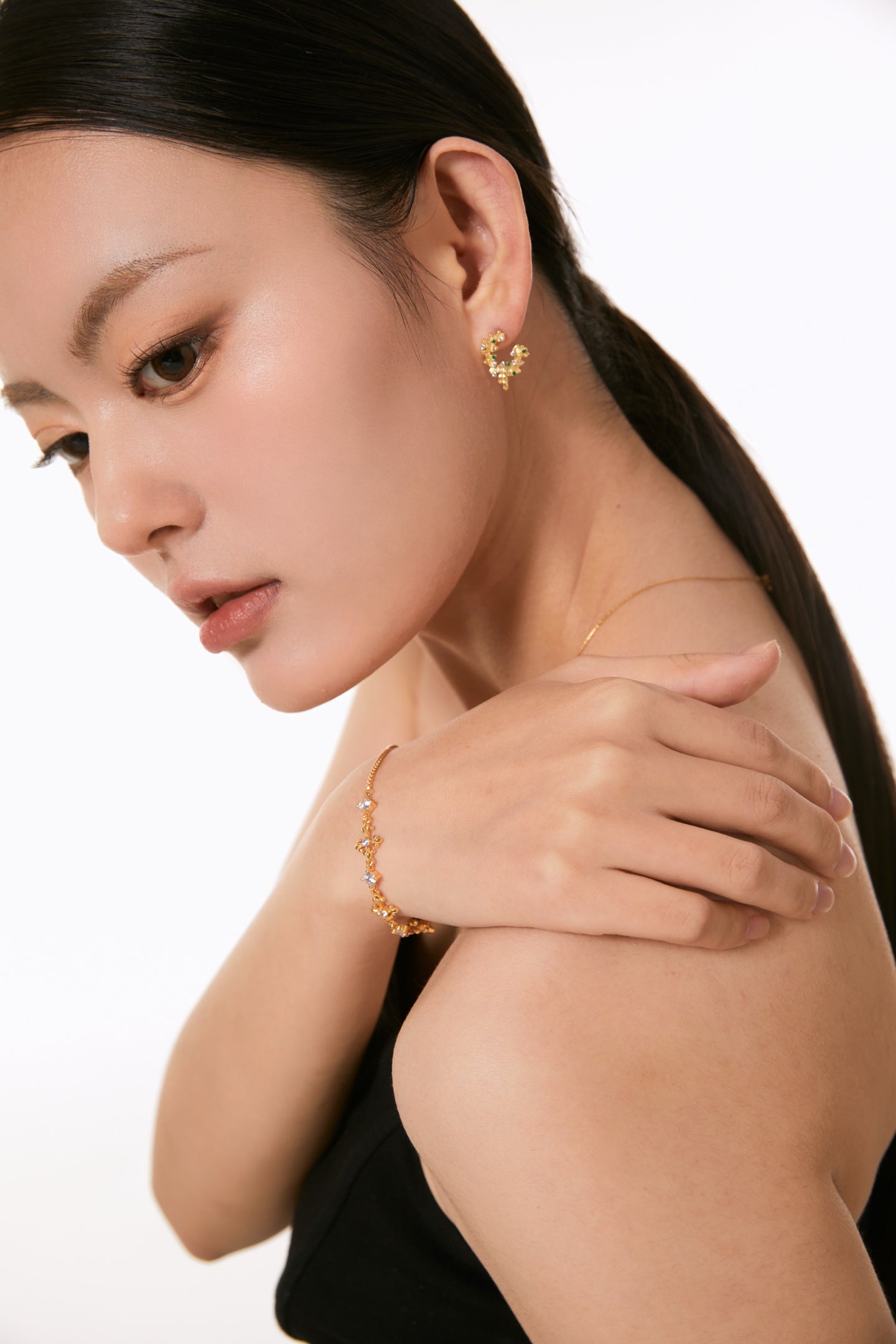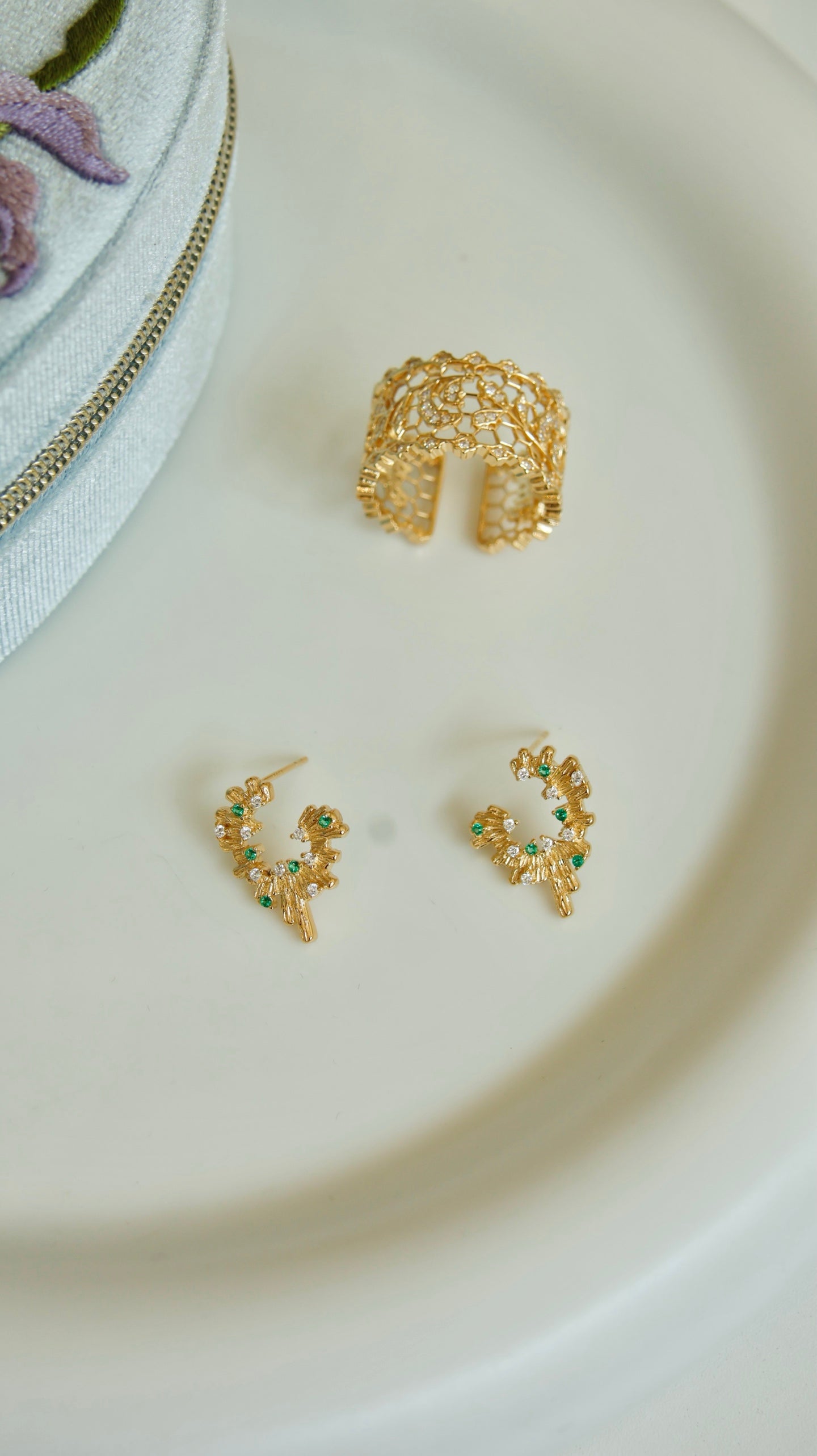 Niche Textured Sterling Silver Earrings - Gold-Tone Emerald Zircon C-Hoop Design, Artistic Statement Jewelry for Women