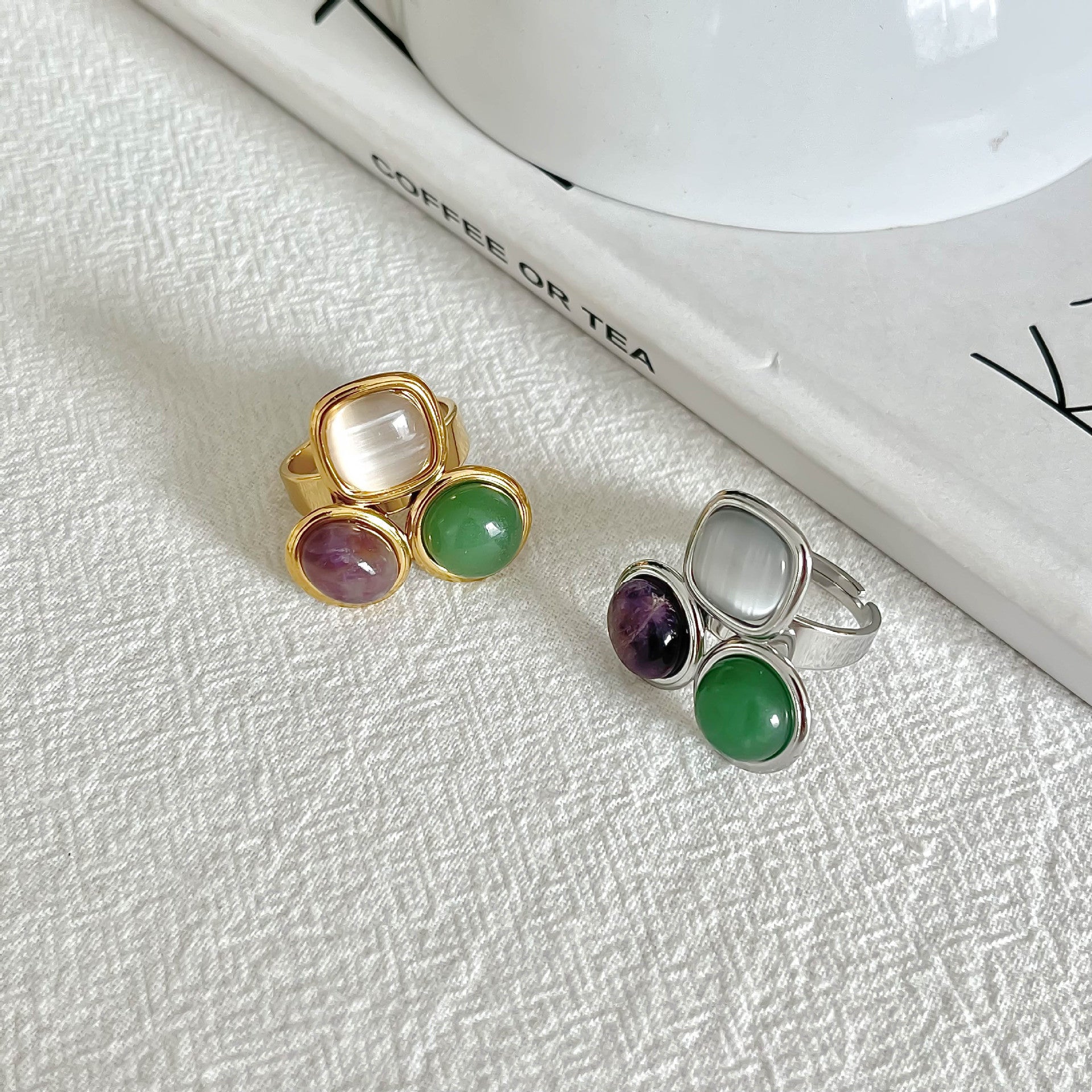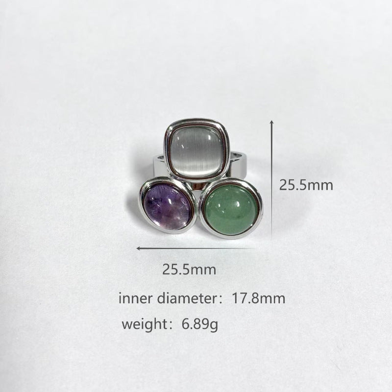 Stainless Steel Three-Tone Natural Stone Geometric Open Ring - Minimalist, Fashionable & Stylish Ring