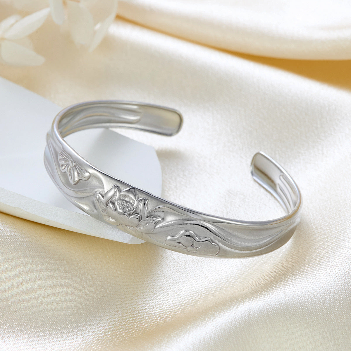 Wholesale Elegant Lotus Bracelet - Thickened Open Stainless Steel Ancient Craft Satin-Finish Bangle